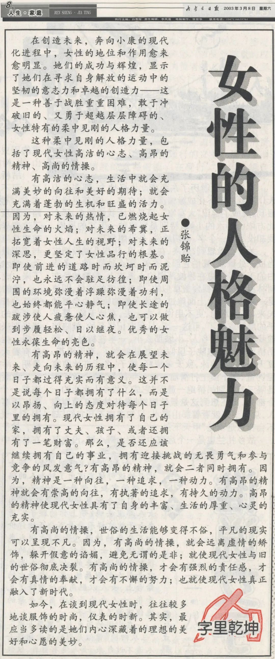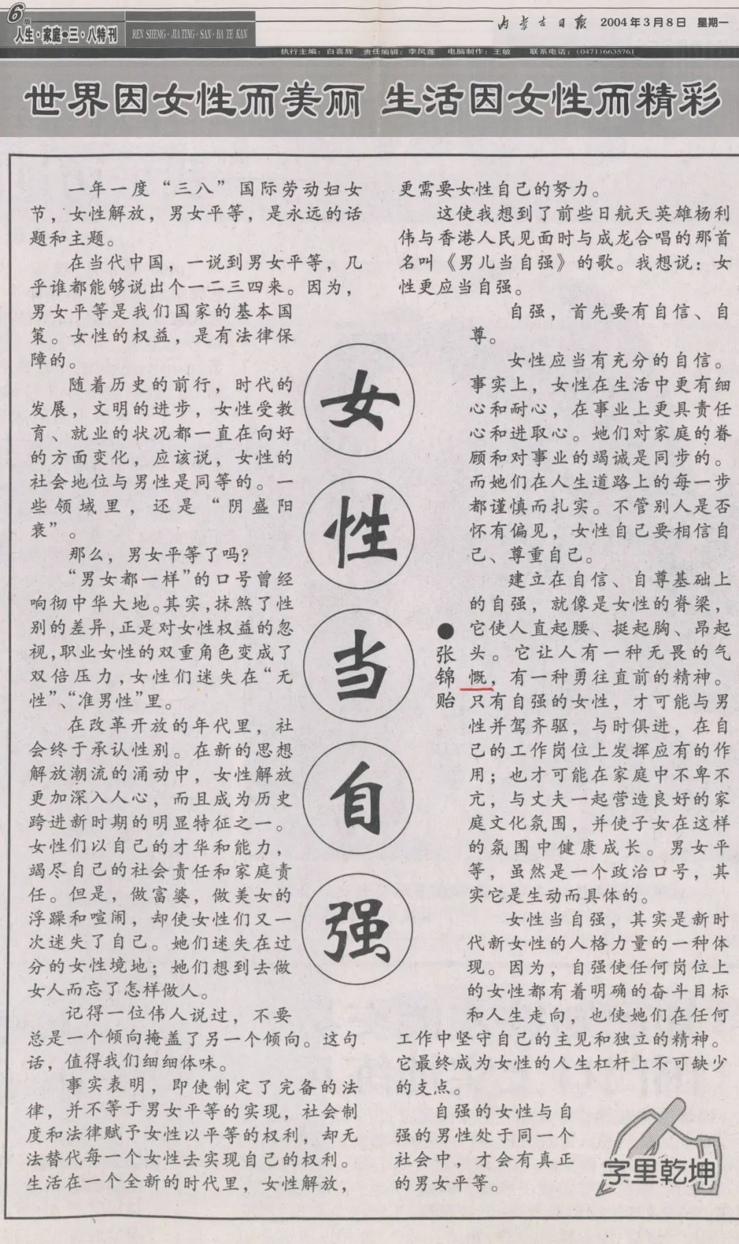 張錦貽老師對(duì)兒童文學(xué)的研究如此耀眼,之于女性群體,張錦貽老師也有著自己獨(dú)特的觀點(diǎn),1990年至2010年間,每逢國際勞動(dòng)?jì)D女節(jié),《內(nèi)蒙古日?qǐng)?bào)》皆會(huì)刊載張錦貽老師關(guān)于女性主題的文章,張錦貽老師對(duì)于女性文學(xué)的厚愛,以及對(duì)女性振臂高呼的豪情一一躍然紙上。